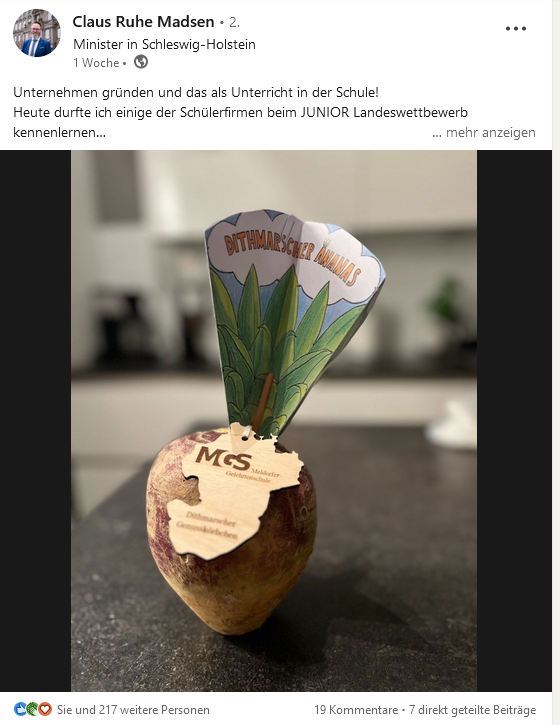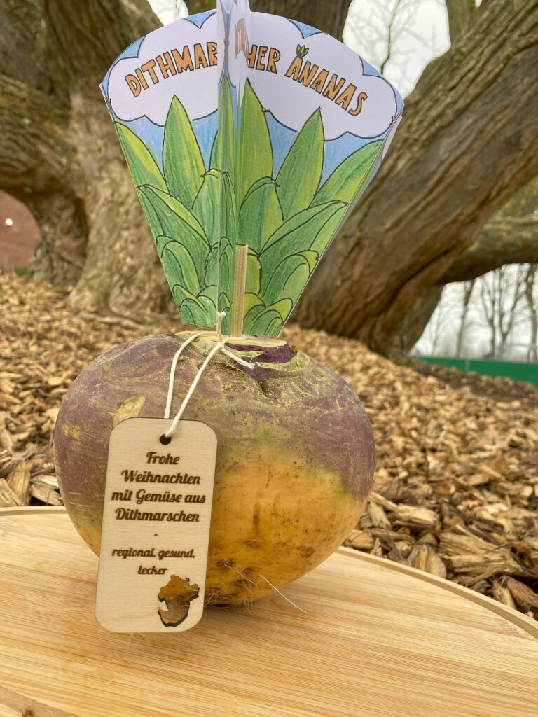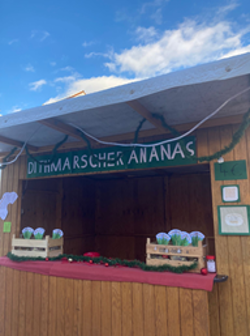 Die legendäre Dithmarscher Ananas der Schülerfirma Genusskörbchen (2023/2024) trägt die künstlerische Handschrift von Willi Dohrmann, nährt auch im Winter und konnte als Zeichen der Dithmarscher Völkerfreundschaft schon unseren Wirtschaftsminister Claus Ruhe Madsen überzeugen. Eine Produktion mit individuellem Anhänger ist auf Anfrage möglich.